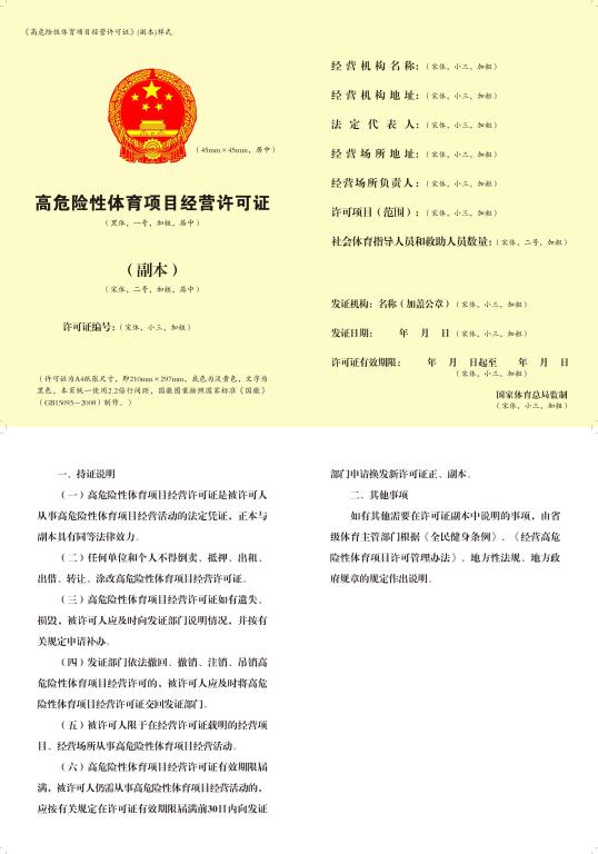 3. 经营高危险性体育项目(潜水)审批条件及程序.docx 4. 经营高危险性体育项目(攀岩)审批条件及程序.docx 5. 经营高危险性体育项目申请书.docx 6. 《高危险性体育项目经营许可证》(正本)样式.jpg 7. 《高危险性体育项目经营许可证》(副本)样式.jpg 8. 高危险性体育项目经营许可证样式说明.docx |