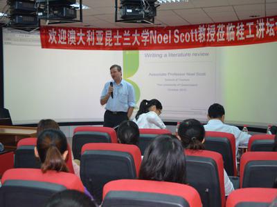 10月12日上午,澳大利亚昆士兰大学Noel Scott教授应旅游学院邀请做客桂工雁山讲坛,在雁山校区04616教室为古天乐代言太阳集团网址学术型和专业学位研究生作了关于“Literature Review(论文综述)”的学术报告。Scott教授分析了中国与西方学术研究的差异,强调了旅游研究理论的重要性,阐述如何将旅游学术研究中的基本概念清晰化,怎样系统撰写论文综述,以及文献筛选的方式方法,同时还介绍了东西方对旅游的不同认识、国际旅游研究最新动态、旅游研究方法创新等方面的一些先进经验。最后,Scott教授结合亲身经历,就如何克服论文写作中的困难同古天乐代言太阳集团网址研究生进行了广泛而深入的交流,并对研究生在学习、研究过程中遇到的问题进行了详细解答。