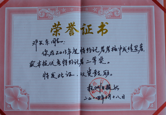 邓兴东同志于2011年9月就读桂林理工大学旅游学院旅游管理专业硕士(MTA),通过两年的学习深造,邓兴东同志的专业知识和工作能力得到一定的提升。毕业以后,邓兴东同志在单位表现非常突出,得到同事和领导的充分肯定。从 2012 年至今,在邓兴东同志不断地努力下,多次获得相关单位的表彰奖励及本单位的职位提升。