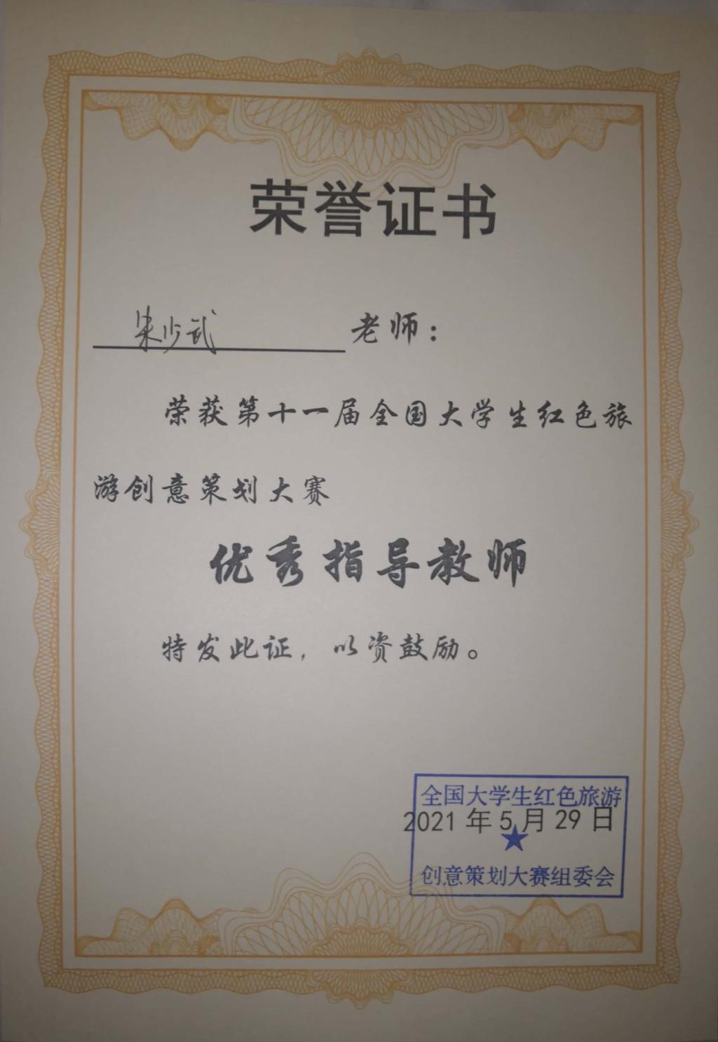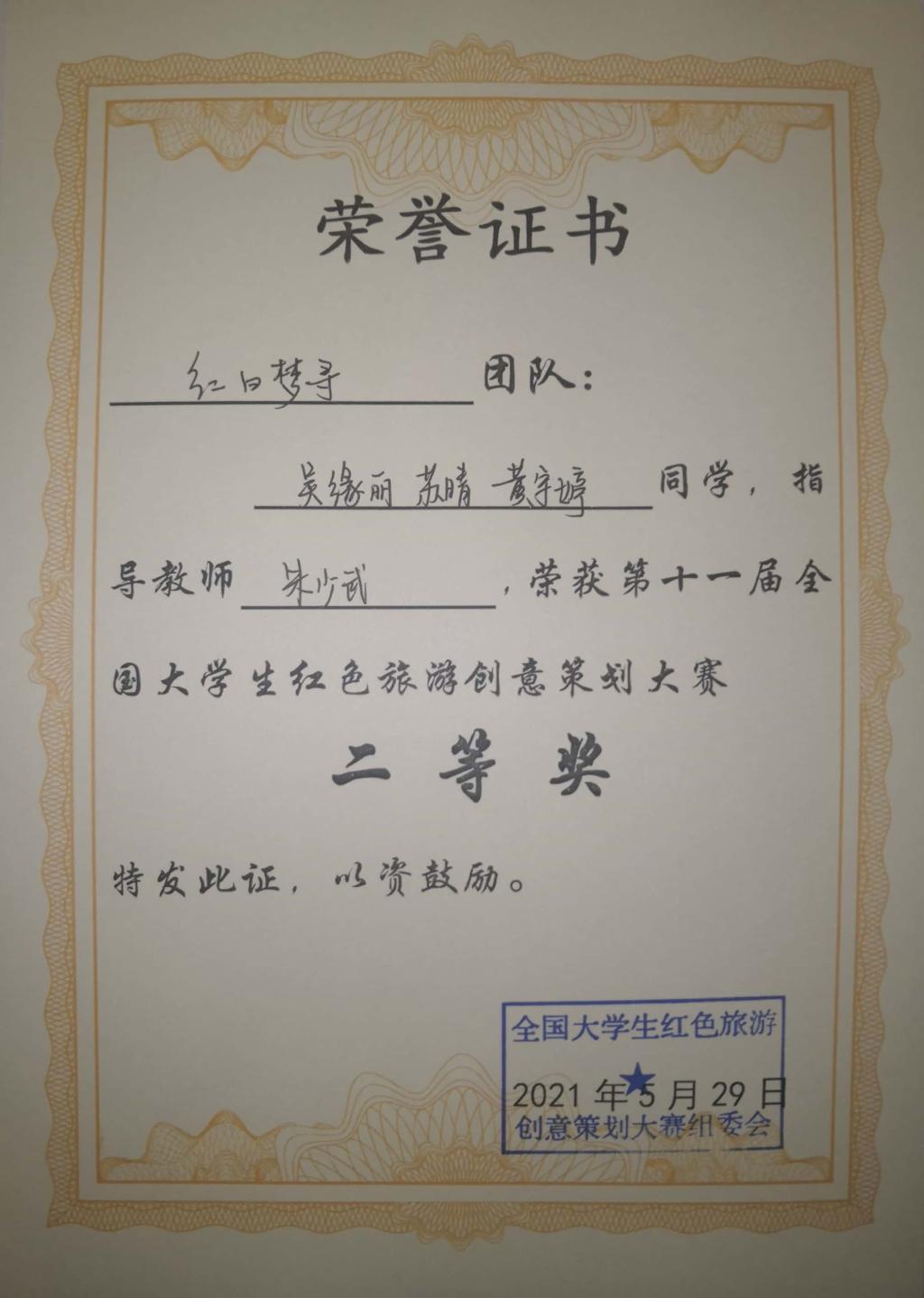 5月26日—6月1日,以“青春追寻红色路 不忘初心跟党走——庆祝中国共产党成立一百周年”为总主题的第十一届全国大学生红色旅游创意策划大赛决赛在浙江省嘉兴市举行,古天乐代言太阳集团网址2018级吴缘丽、苏晴、黄宇婷三位同学荣获全国二等奖,朱少武老师获优秀指导老师荣誉。