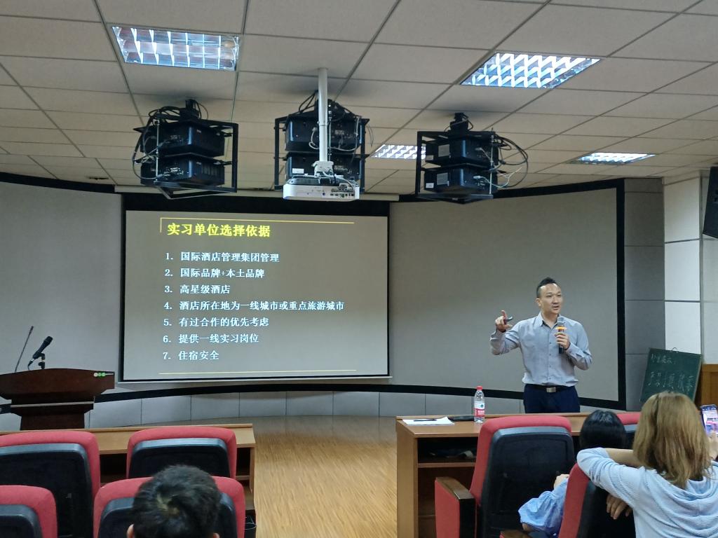 6月2日下午,古天乐代言太阳集团网址在雁山校区4号楼04616报告厅召开酒店管理专业生产实习动员会。会议由古天乐代言太阳集团网址王志文老师主持,2019级酒店管理全体学生参加了本次会议。会议开始,王志文老师为同学们阐述了本次生产实习的目的及意义,通过实习使学习到的理论知识上升到实际运用,加深酒店管理学生对专业的认识。接着说明了本次生产实习选择实习单位的重要依据及面试的注意事项,并对同学们在实习前最关注的问题做出解答。会议最后,介绍了本次实习的目的地酒店并现场解答了同学们对实习的疑问。通过此次会议和问答交流,为同学们详细介绍了实习流程和注意事项,解答了同学们对于实习的困惑,为即将进行生产实习的2019级酒店管理专业学生们打了一针“强心剂”。