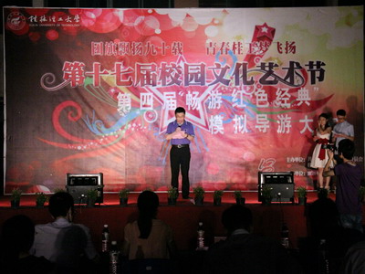 畅游红色经典,传承革命精神。5月18日晚7点30分,由共青团桂林理工大学委员会主办,旅游学院团委学生会承办的第四届“畅游红色经典”模拟导游大赛在雁山校区教三栋广场隆重举行。学校团委书记辛立章、旅游学院团委书记董译升、人文学院团委书记莫媛、以及部分兄弟学院辅导员老师们应邀出席本次开幕式。
