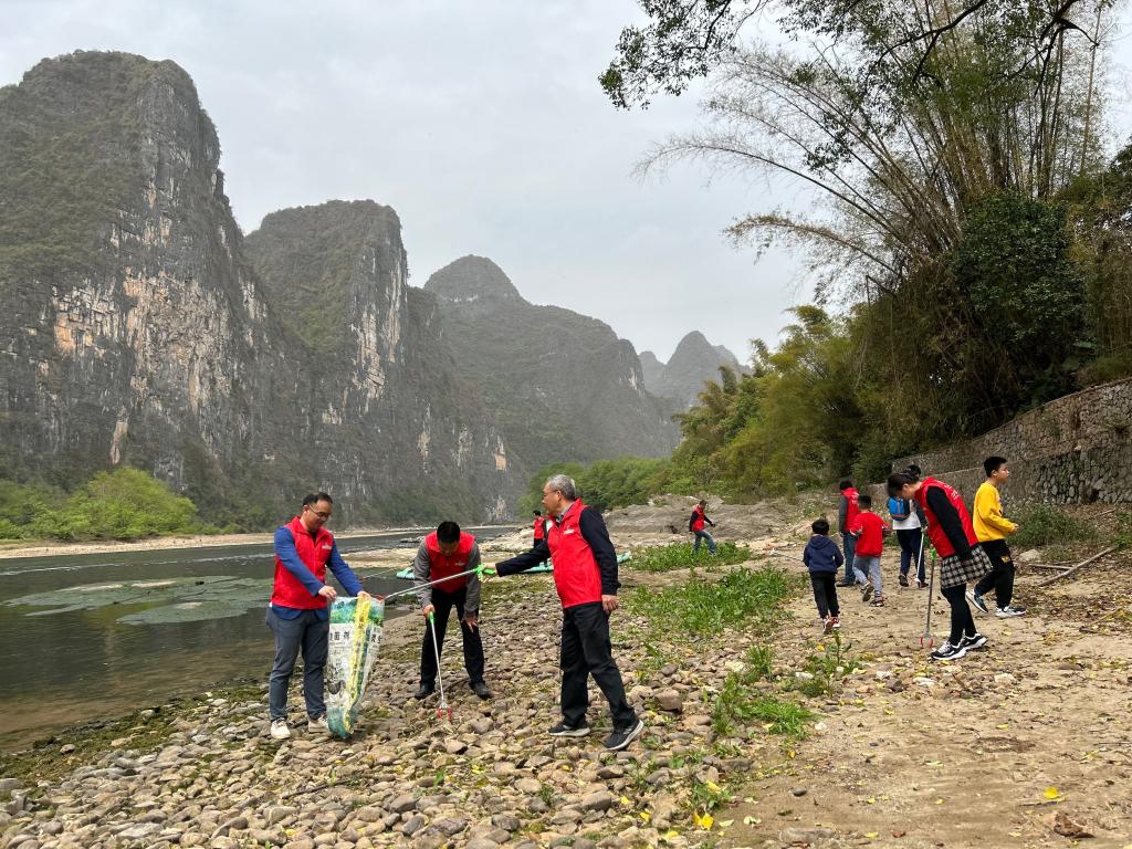 图为志愿者们认真完成漓江边的垃圾清理工作
