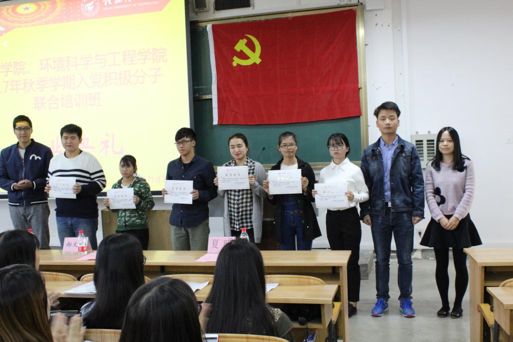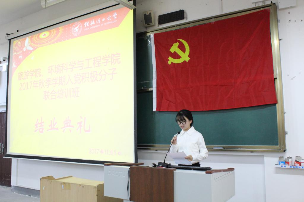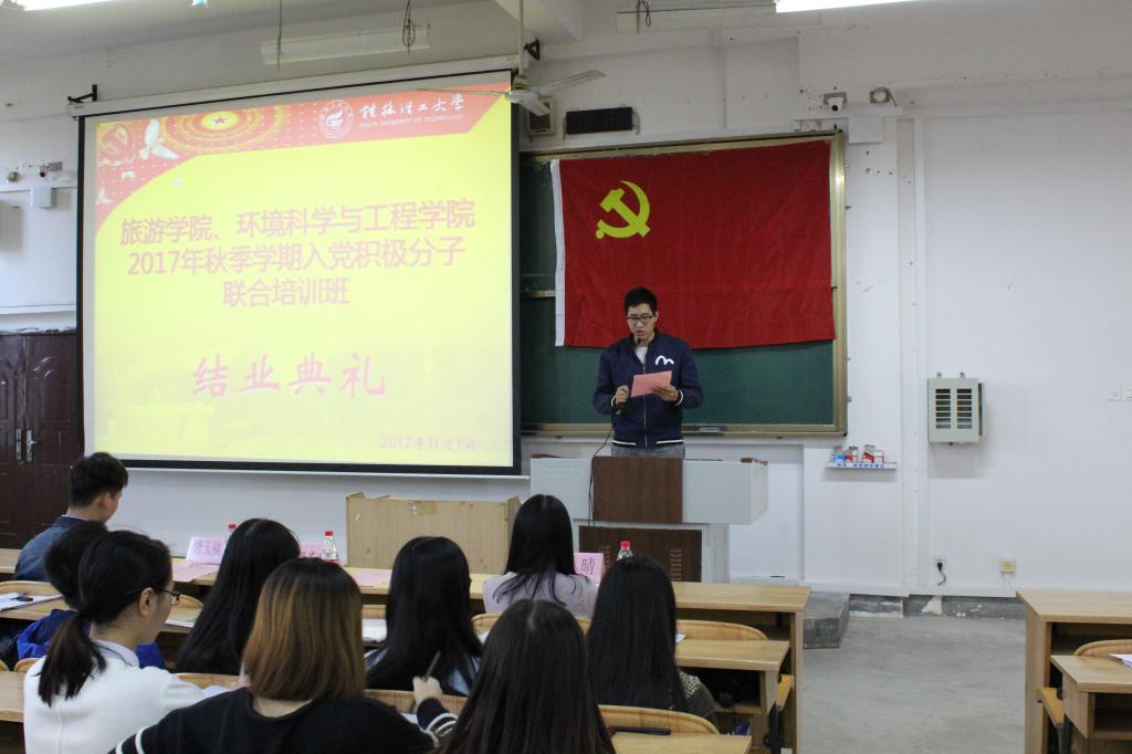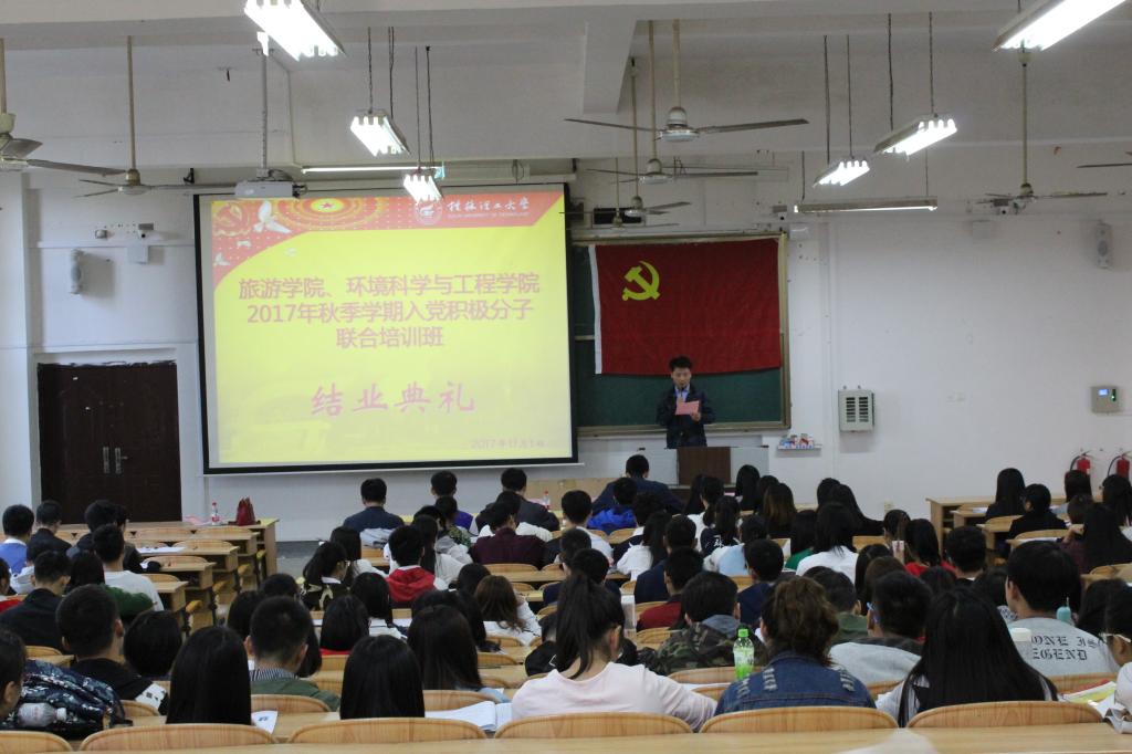 2017年11月1日中午12:30分,桂林理工大学旅游学院、环境科学与工程学院联合分党校2017年秋季积极分子培训班结业典礼在06105举行。环境科学与工程学院党委副书记郝文佳老师、辅导员夏晴老师以及旅游学院辅导员唐玉福老师出席典礼。典礼由夏晴老师主持。