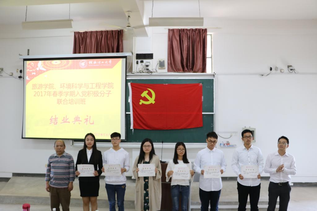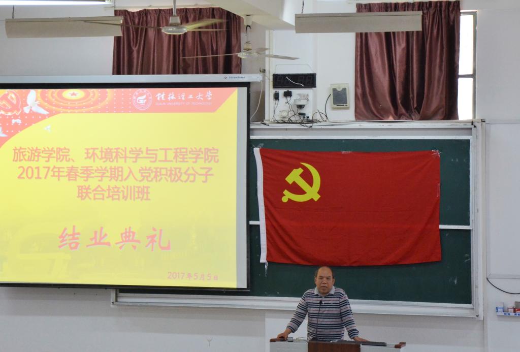 5月5日中午12:20分,桂林理工大学旅游学院、环境科学与工程学院联合分党校2017年春季学期积极分子培训班结业典礼在05314举行。旅游学院党委书记、分党校校长李少游老师,环境科学与工程学院团委书记、分校长教务长唐红兵老师,环境科学与工程学院教务员田明浩老师出席典礼。典礼由旅游学院分党校教务员张露萍老师主持。