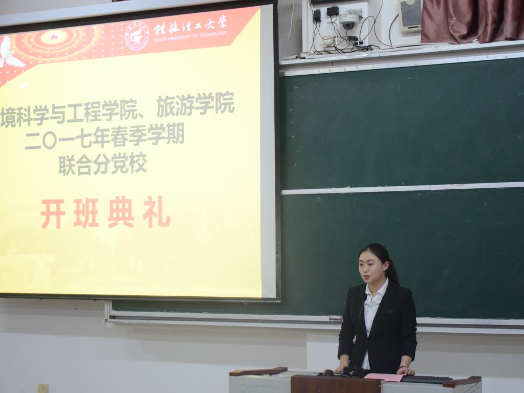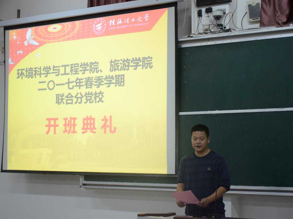 2017年4月8日晚,环境科学与工程学院、旅游学院在雁山校区05314教室联合举行了“旅游学院、环境科学与工程学院联合分党校积极分子培训班”开班典礼。环境科学与工程学院党委书记王璐老师、旅游学院团委书记李少华老师以及古天乐代言太阳集团网址16级辅导员田明浩老师分别出席了本次典礼,本次典礼由环境学院分党校教务员田明浩老师主持。