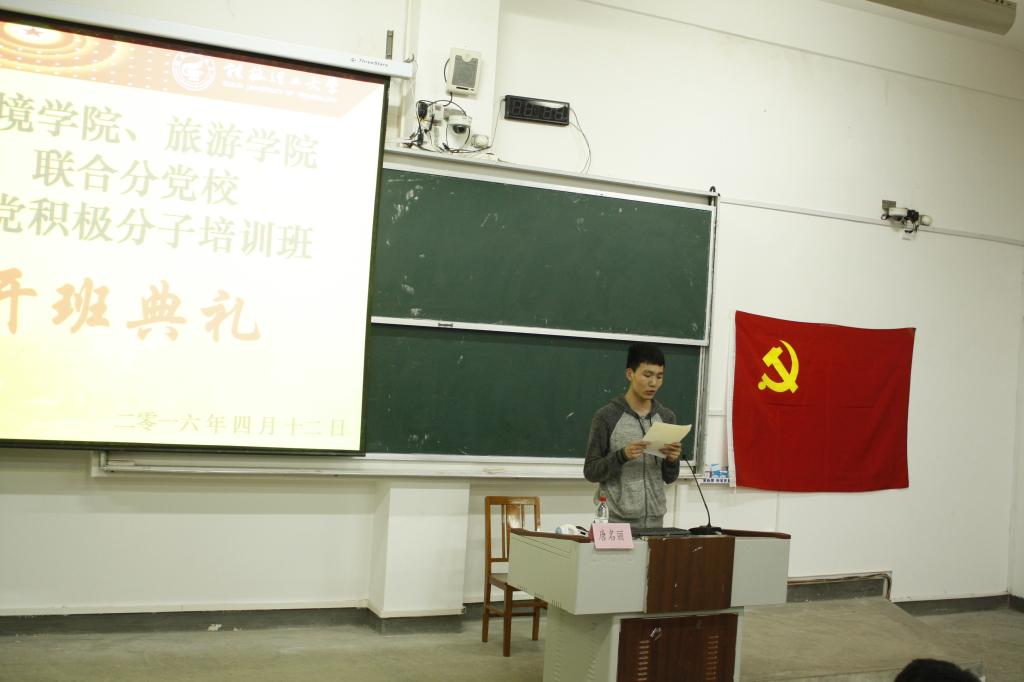 2016年4月12日晚19点,我校旅游学院、环境科学与工程学院联合分党校入党积极分子培训班开班典礼在雁山校区05307教室隆重举行。典礼由旅游学院唐名丽老师主持,环境科学与工程学院党委书记王璐,环境学院辅导员田明浩,旅游学院辅导员唐玉福出席了开班典礼。