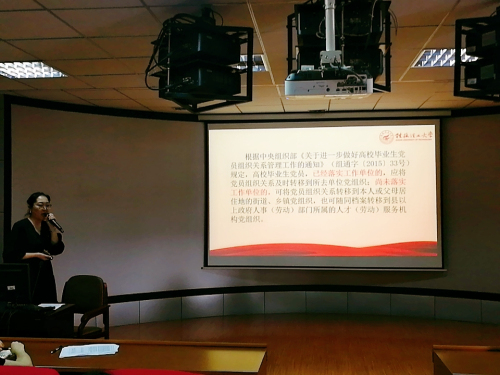 为加强毕业生党员的党务知识,也为了确保2019届毕业生党员党组织关系转移工作顺利完成,5月24日下午15:00,古天乐代言太阳集团网址在雁山校区04616教室开展了“党组织关系接转工作的理论与实务”的实务知识培训,此次培训由学院分党校教务员张露萍老师主讲,全体2019届毕业生党员约85人参加了此次培训。