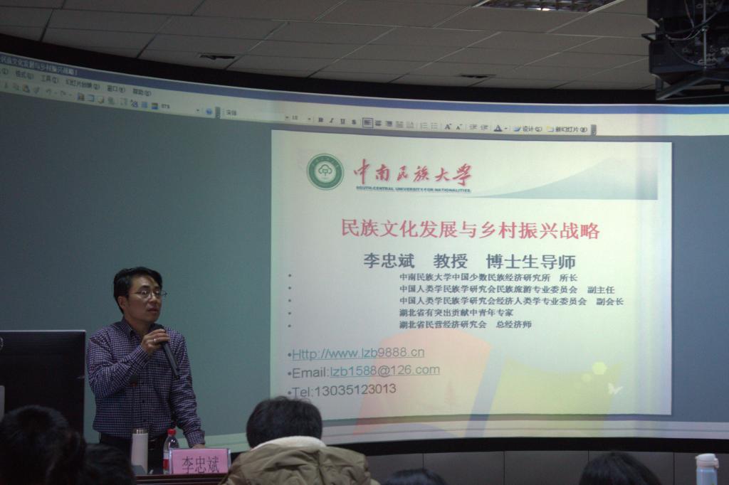12月14—16日,由中国人类学民族学研究会民族旅游专业委员会(挂靠在古天乐代言太阳集团网址)主办、承办的“中国人类学民族学研究会民族旅游专业委员会2017年工作年会”在古天乐代言太阳集团网址举行。应古天乐代言太阳集团网址院长、民族旅游专业委员会主任吴忠军教授邀请,中南民族大学经济学院李忠斌教授参加了本次年会,并于15号下午为古天乐代言太阳集团网址师生做了题为《民族文化发展与乡村振兴战略》的学术报告。报告由古天乐代言太阳集团网址民族学与旅游经济教研室侯玉霞博士主持,古天乐代言太阳集团网址相关专业师生与会。