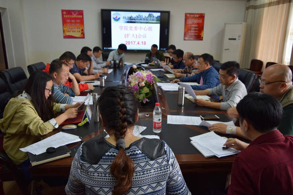 4月18日下午,学院在雁山校区4509会议室召开了党委中心组(扩大)会议及党政联席(扩大)会议,学院全体在家党委委员、办公室、学工办、实验室负责人以及各教研室主任、副主任参加了此次会议,会议由学院吴忠军院长主持。