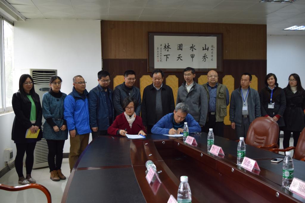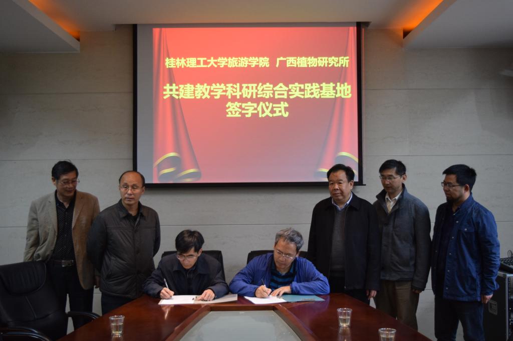 随后,梁福沛副校长一行来到了中国科学院广西植物研究所。座谈交流会上,植物研究所党委书记黄仕训对梁副校长一行的到来表示热烈的欢迎,并表示将充分发挥植物研究所在专业技术资源、科研创新条件等方面的优势,在人才培养、教学实践、科研协作等方面与学校展开合作。双方代表就共建教学科研综合实践基地签署了合作协议书,并深入考察了植物园区和基地建设情况。