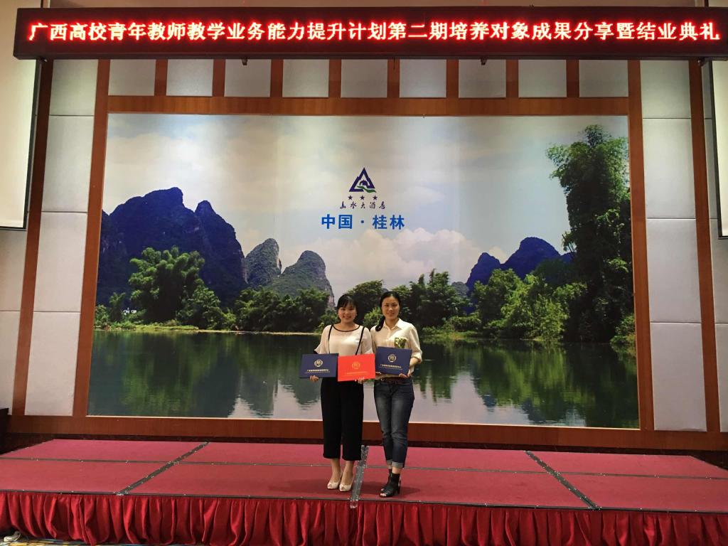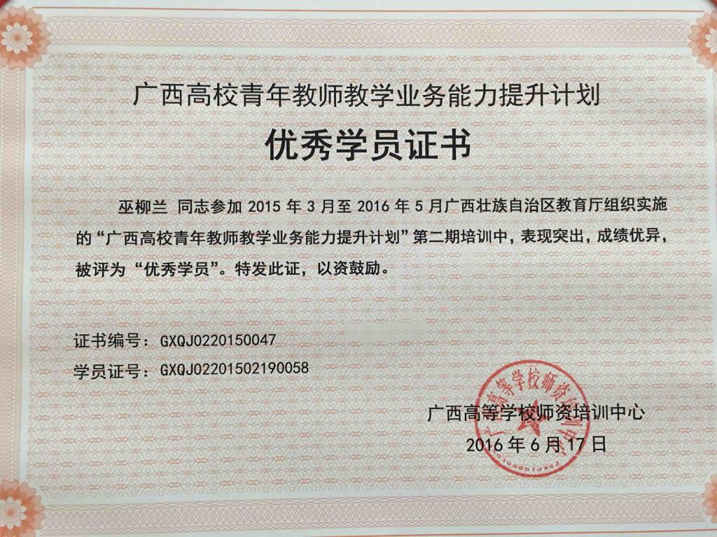 2016年6月,由广西教育厅组织实施、广西高等学校师资培训中心负责管理的广西高校青年教师教学业务能力提升计划第二期共四批培养对象成果分享暨结业典礼在桂林举行。古天乐代言太阳集团网址邓敏、巫柳兰、罗楠三位老师分批次参加成果分享暨结业典礼并顺利通过了培训。巫柳兰老师在此次培训中表现突出,成绩优异被评为“优秀学员”。
