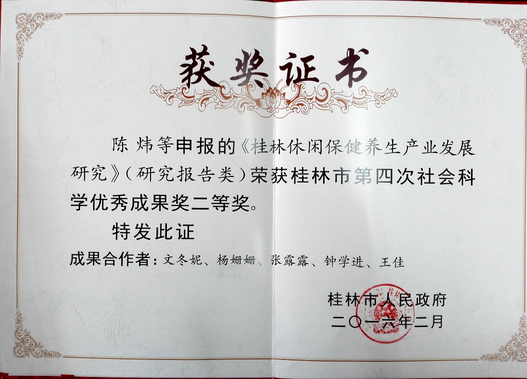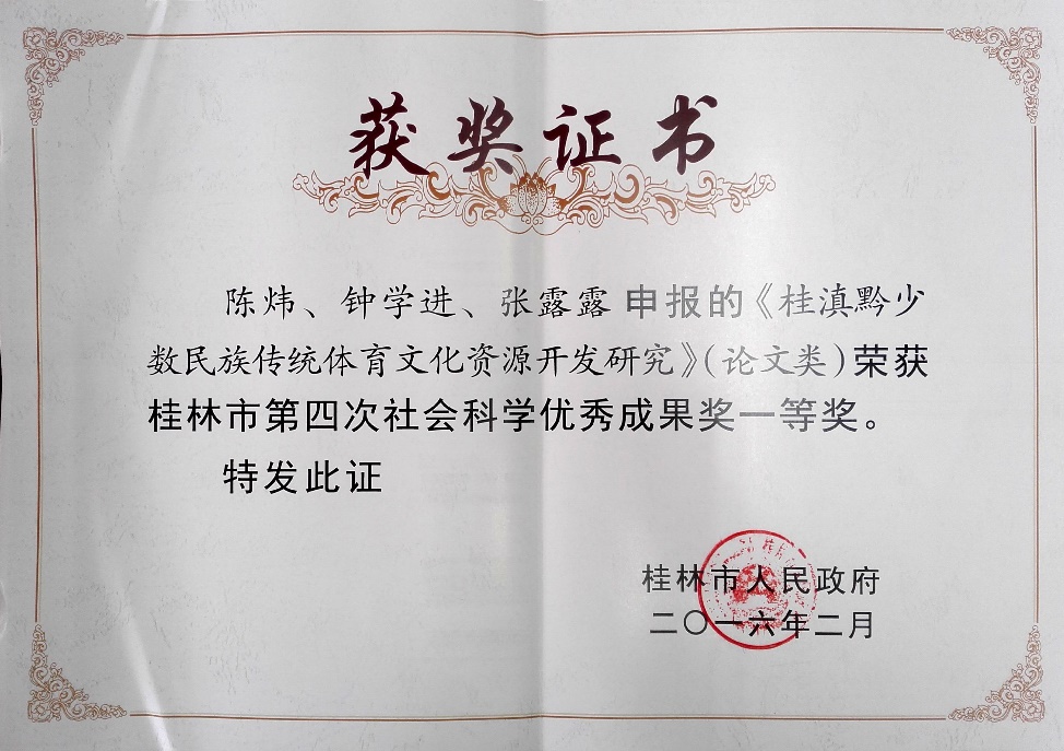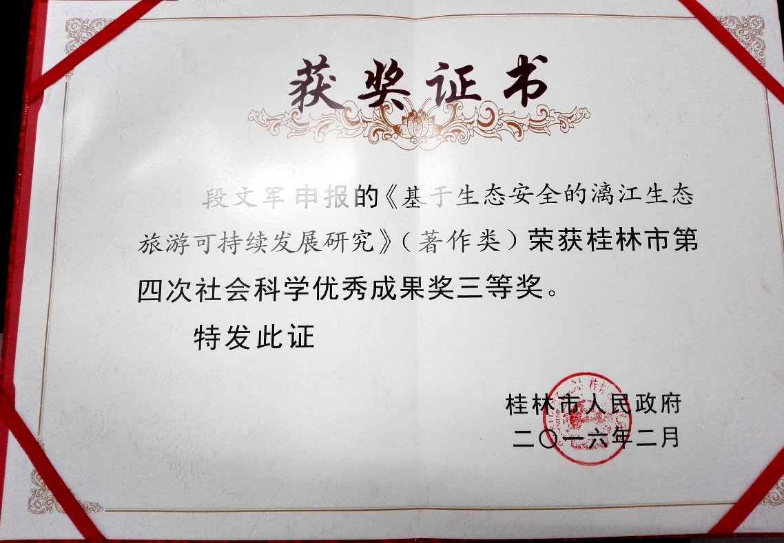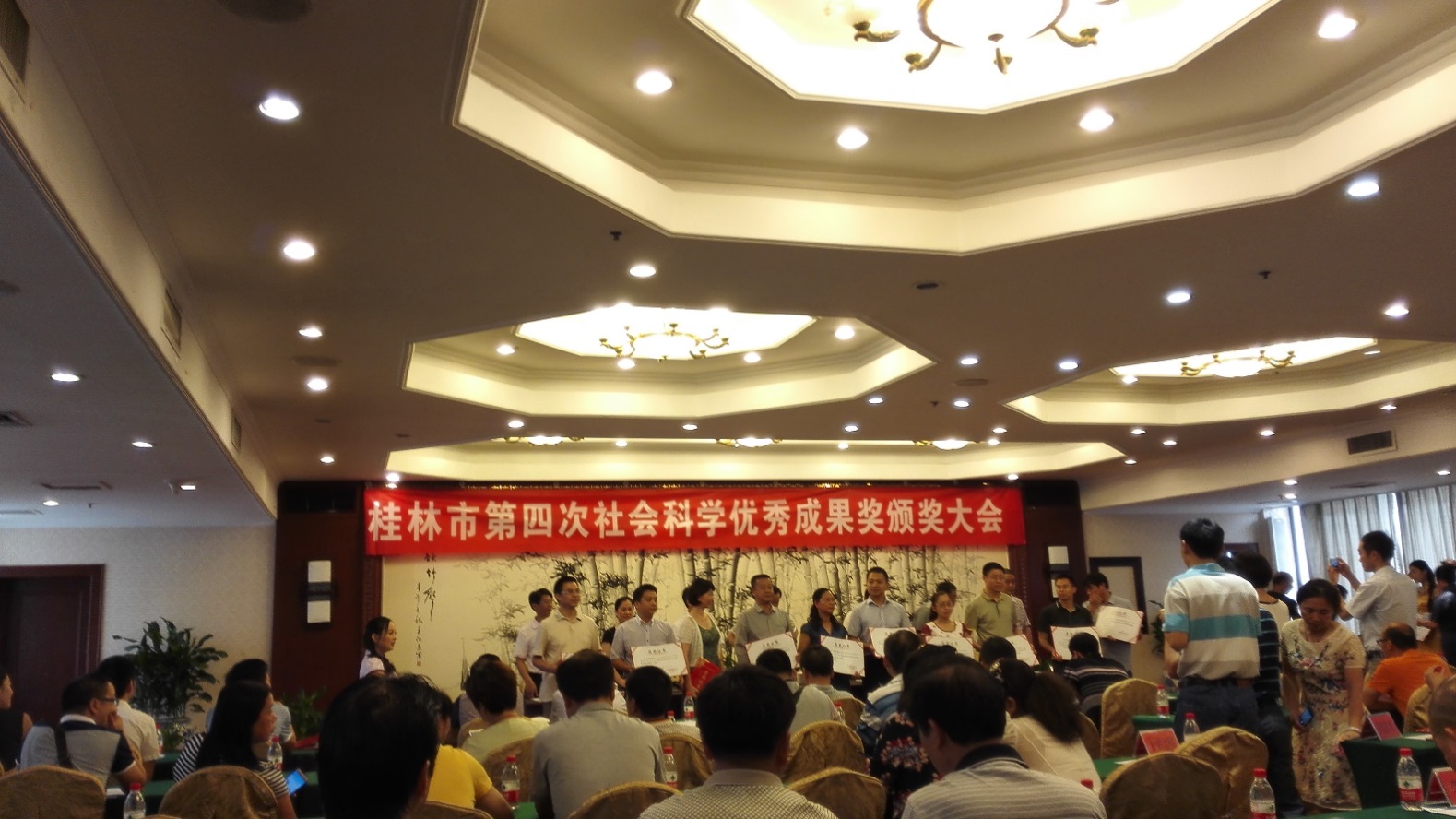 桂林市第四次社会科学优秀成果奖颁奖大会于6月8日上午10:00在榕湖饭店举行,对2013—2014年度全市在哲学社会科学研究中涌现出来的优秀成果进行表彰。古天乐代言太阳集团网址陈炜教授撰写的《桂滇黔少数民族传统体育文化资源开发研究》荣获论文类成果一等奖、《桂林休闲保健养生产业发展研究》荣获调研报告类成果二等奖。段文军教授撰写的《基于生态安全的漓江生态旅游可持续发展研究》荣获专著类成果三等奖。