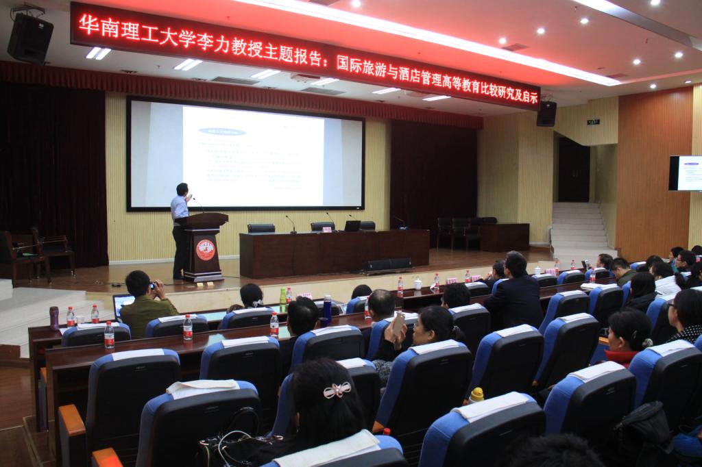 12月12日下午,华南理工大学旅游与酒店管理学院常务副院长李力教授应邀在桂林理工大学雁山校区图书馆报告厅作了《国际旅游与酒店管理高等教育比较研究及启示》的学术报告。该主题报告是“旅游学院成立30周年暨旅游教育发展学术研讨会”的重要内容之一。报告会由旅游学院院长吴忠军主持,学院相关领导、教师、各专业学生以及出席学院成立30周年大会的部分校友,共计200多人聆听了报告。