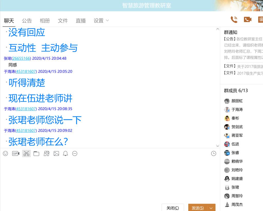 为保证疫情期间线上教学的顺利开展,2020年4月15日,智慧旅游管理教研室通过QQ群召开线上教学工作会议。会议由教研室主任于海涛老师主持,智慧旅游管理教研室全体教师参加了此次会议。