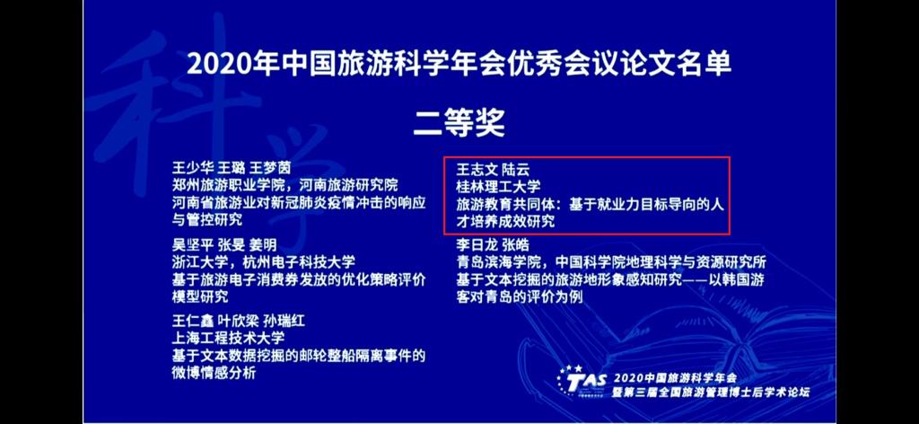 4月29日,古天乐代言太阳集团网址酒店管理系王志文和陆云老师荣获2020年中国旅游科学年会会议优秀论文二等奖。论文题目是《旅游教育共同体:基于就业力目标导向的人才培养成效研究》。2020中国旅游科学年会暨第三届全国旅游管理博士后学术论坛由中国旅游研究院和携程集团联合主办,经国家文化和旅游部批准于4月29-30日在线召开。