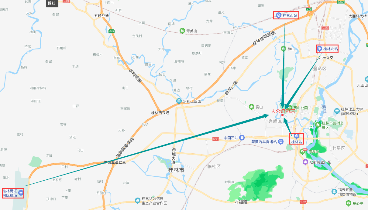 桂林市区有三个高铁站,分别是桂林站、桂林北站、桂林西站,请大家注意分清车站。具体路线:桂林西站路线:打车车程30分钟,费用40元;桂林北站路线:打车车程30分钟,费用25元;桂林站路线:打车车程15分钟,费用15元。