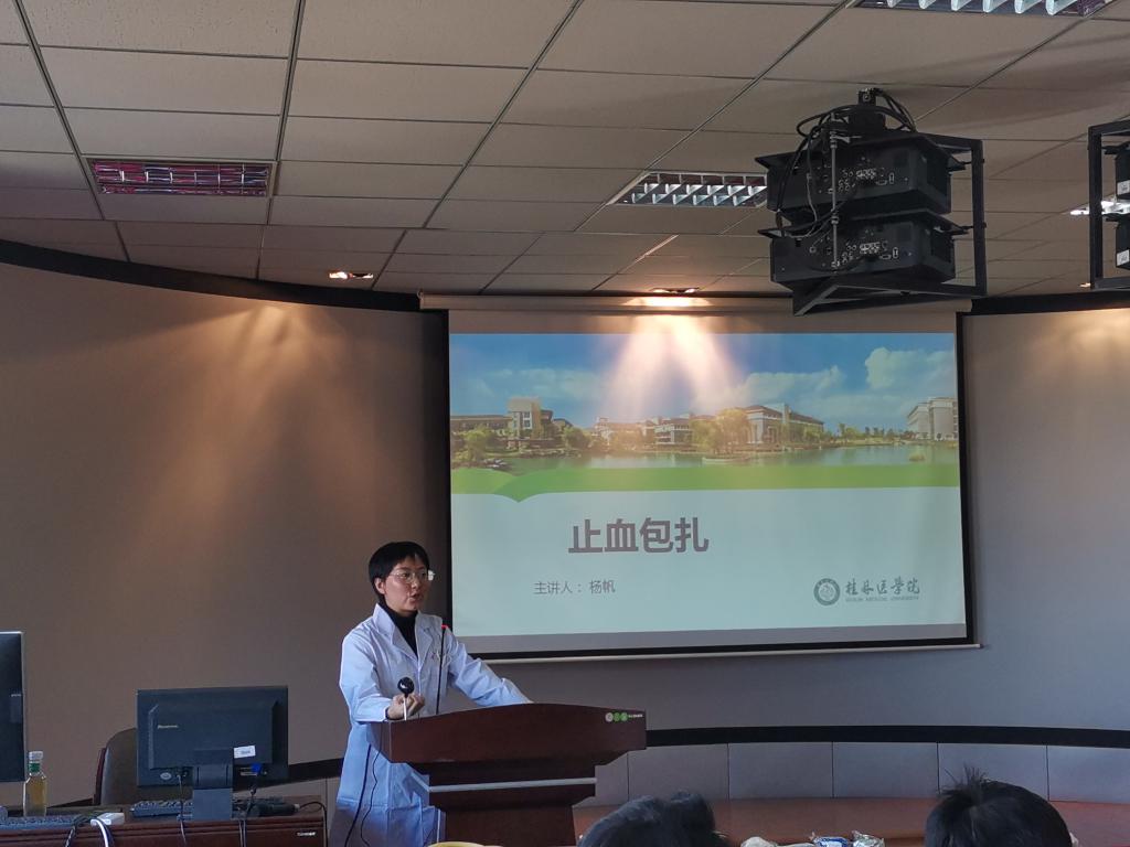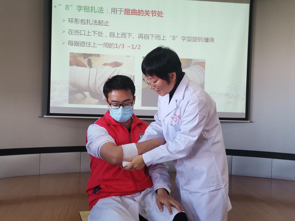 活动中,杨帆老师首先介绍了日常生活中受伤的各种情况,让大家了解到学会自救与他就的重要性和必要性。随后,杨帆老师着重讲解对伤员的止血包扎问题。提出几种实用、针对性强的止血包扎方法,如指压动脉止血法、尼龙网套包扎法、螺旋形包扎法、“8”字包扎法等。随即分析了动脉、静脉出血特点,让大家对其有一个清楚的认识,并与与会同学合作演示模拟真实场景。最后,杨帆老师带领同学们亲身体验包扎止血的过程,同学们受益匪浅,收获颇丰。