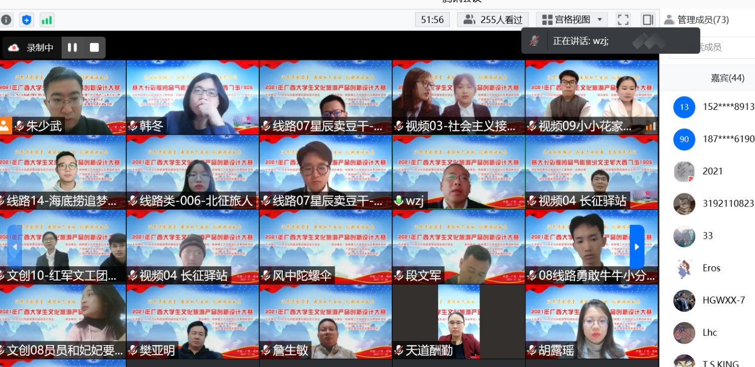 广西文化和旅游策划规划设计协会副会长黄耀武、桂林理工大学古天乐代言太阳集团网址院长吴忠军出席了11月28日举行的大赛(决赛)在线交流会议并致辞,来自广西师范大学、桂林理工大学、桂林旅游学院、广西博驰规划设计有限公司等多位行业专家及嘉宾对入围决赛的作品进行在线专业点评。最后大会公布了各类作品拟授予特等奖、一等奖、二等奖等次名单。其中“北征旅人”团队的《湘江英勇突围记,红耀长征旅振兴》作品拟授予文化旅游线路策划类特等奖;“红军文工团乙亥年分团”团队的《“摧难溯志”桂北旅游文创产品设计》作品拟授予旅游文创产品创意设计类特等奖;“小小花家人”团队的《红色印记·魅力兴安-长征文化兴安段》作品拟授予文化旅游营销创意策划(视频制作)类特等奖。