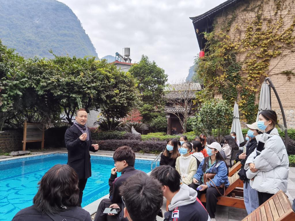 期间,酒店管理教研室王志文主任带领26名本科生在墨兰山舍泳池边开展了别开生面的现场教学活动。王志文老师由浅入深,由点到面地引领同学们对乡村民宿的客房类型设计、客源市场营销策略等方面进行思考、探讨,并鼓励同学们提出自己的见解。