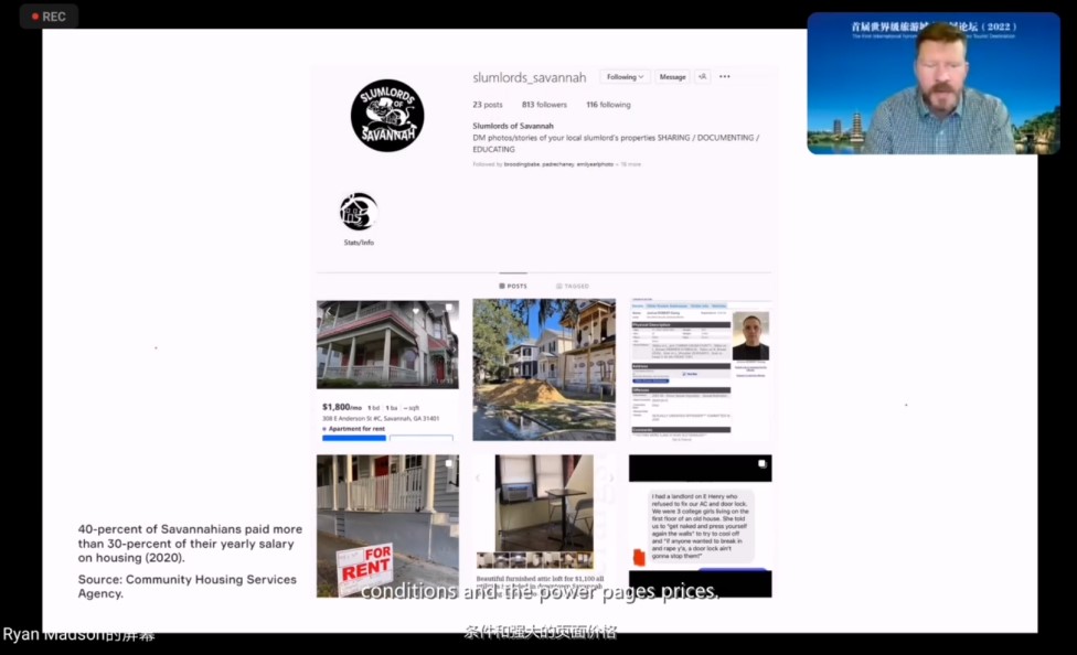 麦德森教授在报告开头介绍了萨凡纳这座城市的发展历程以及蕴含的旅游资源,他指出萨凡纳的风景和历史资源正面临着被游客过度消费的危险,城市中出现了许多具有争议的空间,因此当地居民正在努力从宜居性和旅游业的经济逻辑之间找到平衡。