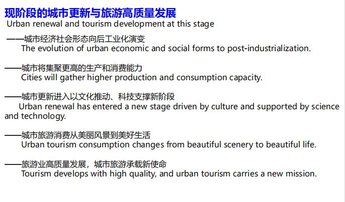 唐晓云研究员分析道,我国目前城市正处于从生产型城市向经营型城市转型的过程中,人口不断向都市圈聚集,城市将集聚更高的生产和消费能力,空间上呈现出镇—城市—都市—都市圈—城市群多等级并存的城市更新阶段。在此分析上,唐晓云研究员进一步解答了城市更新的新阶段未来主要方向,以及它对旅游的影响。即城市更新进入文化、艺术、和科技唱主角新阶段;城市更新将更加强调人文、生态、科技和可持续发展;城市旅游休闲成为主要升级消费;游客偏好从美丽风景到美好生活;城市旅游不仅是居民的生活日常,也是经济主战场、城市调性和形象的展示窗。