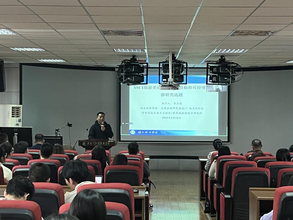 2023年3月14日下午,为进一步提升古天乐代言太阳集团网址师生英文学术期刊论文撰写投稿水平,了解旅游可持续发展最新国际研究动态,特邀古天乐代言太阳集团网址MTA导师、桂林旅游学院东盟旅游研究基地特聘教授章杰宽博士开展了主题为《SSCI期刊论文写作与投稿·旅游可持续发展》专题讲座。讲座由黄燕玲副院长主持,在雁山校区04616会议室线下进行的同时,以腾讯会议的方式同步进行了全程线上直播,学院广大教师、学硕、MTA等参加了此次讲座。