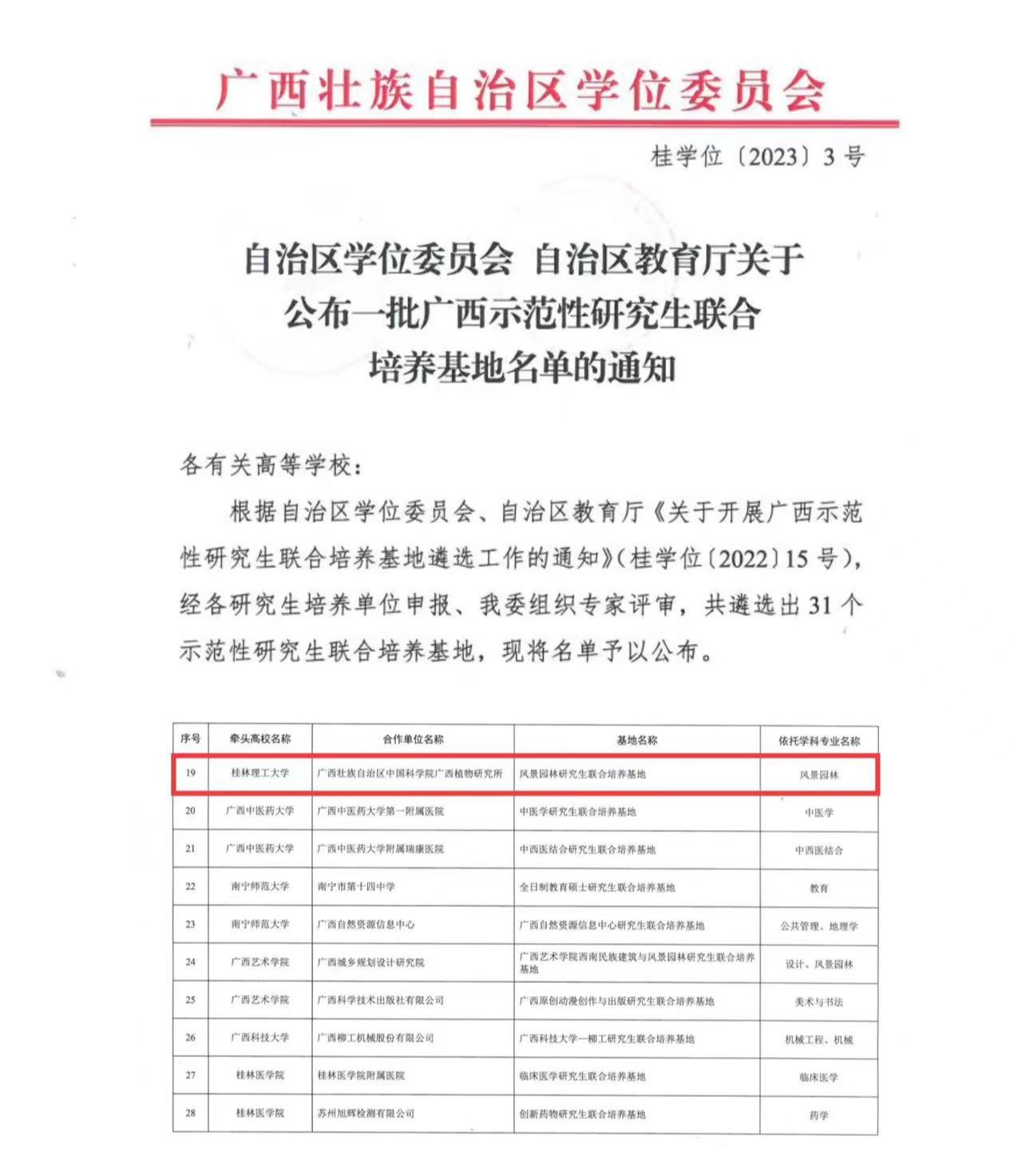 近日,自治区学位委员会公布了广西示范性研究生联合培养基地名单,古天乐代言太阳集团网址风景园林研究生联合培养基地(合作单位:中国科学院广西植物研究所)被列为第一批广西示范性研究生联合培养基地。