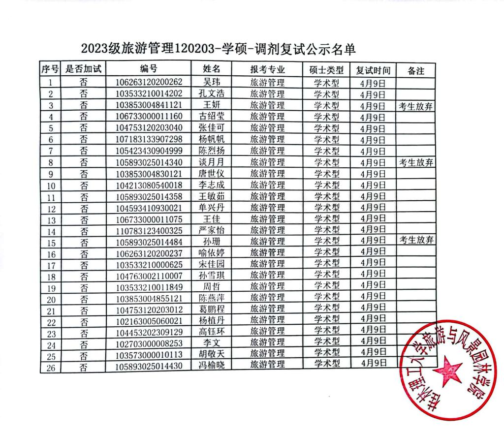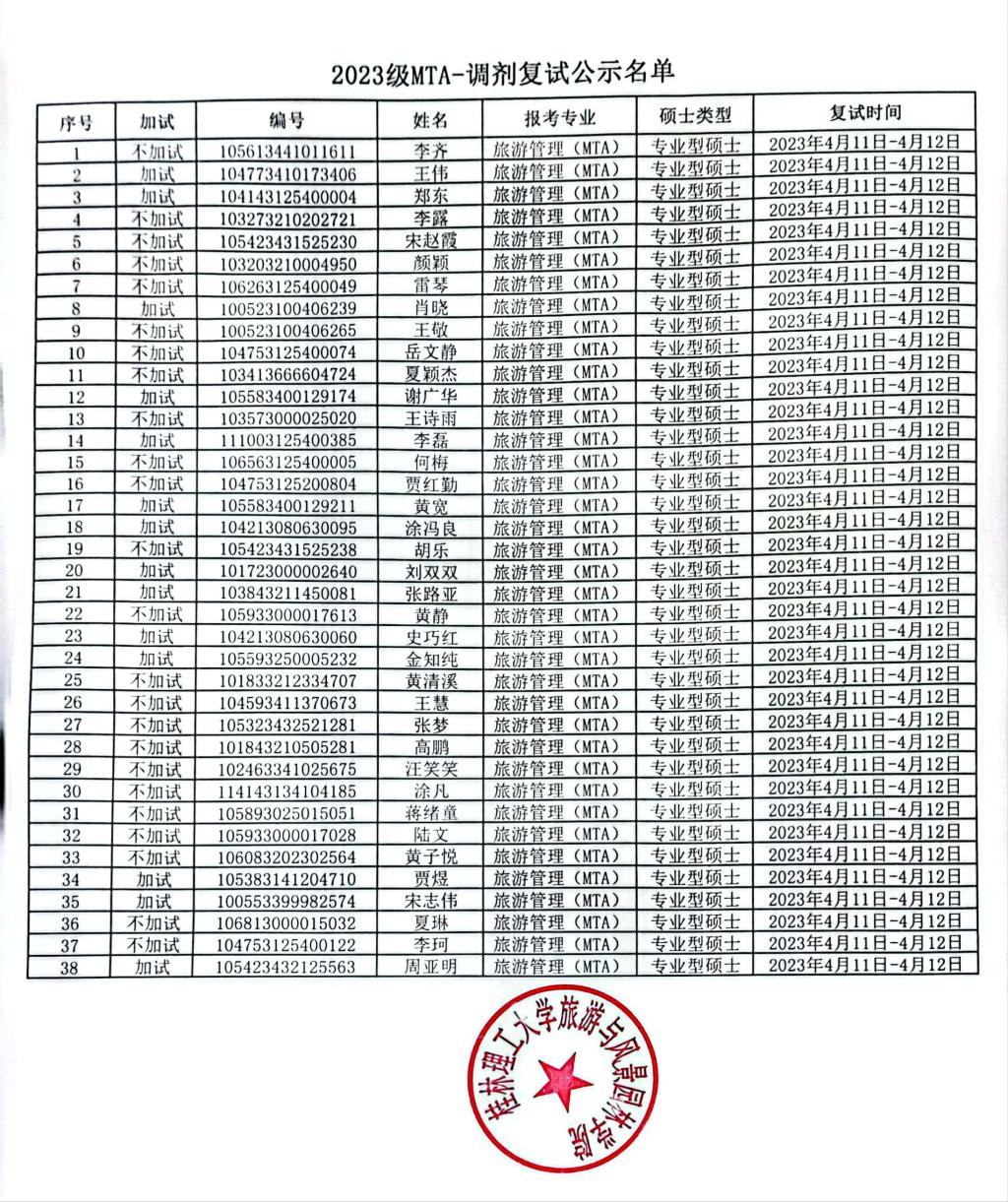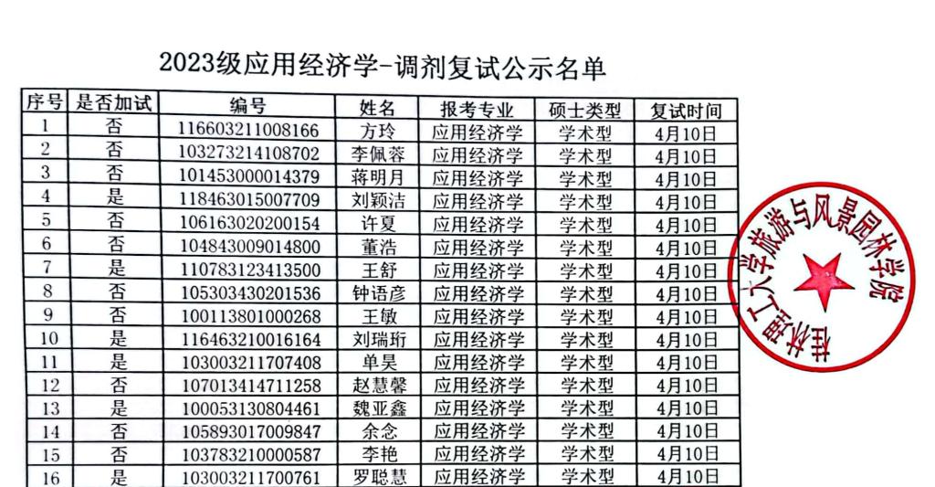 根据《桂林理工大学2023年硕士研究生复试录取工作办法》,参照风景园林学硕士研究生复试录取工作细则、应用经济学硕士研究生复试录取工作细则、旅游管理(MTA)硕士研究生复试录取工作细则、旅游管理学术硕士研究生复试录取工作细则,现将拟参加古天乐代言太阳集团网址研究生调剂复试名单公示如下: