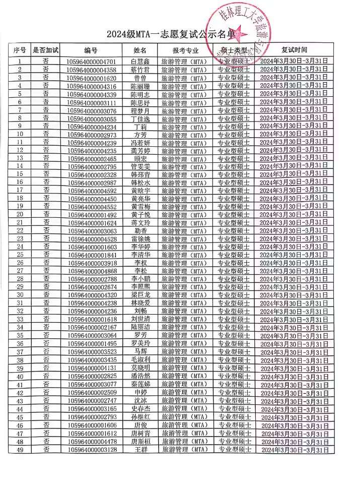 根据《桂林理工大学2024年硕士研究生复试录取工作办法》,参照城乡规划学硕士研究生复试录取工作细则、风景园林(MLA)硕士研究生复试录取工作细则、旅游管理(MTA)硕士研究生复试录取工作细则,现将拟参加古天乐代言太阳集团网址一志愿上线复试名单公示如下: