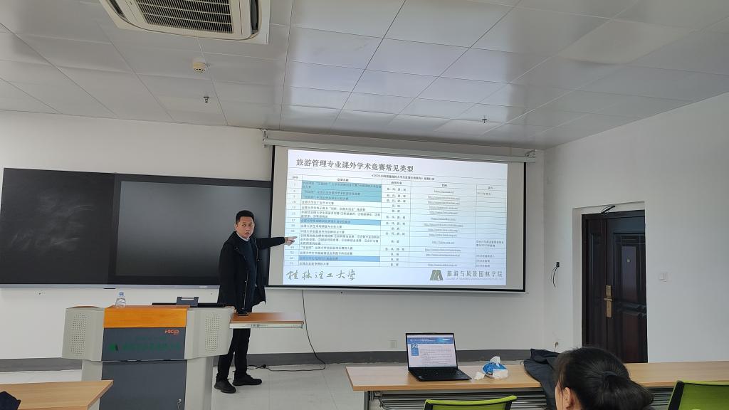 讲座中,王佳果老师首先阐述了课外学术竞赛在大学生全面发展中的重要地位,特别是对于旅游管理专业学生而言,学科竞赛不仅是实践所学理论的重要平台,还能提升学生的综合能力和竞争力。随后,王佳果老师详细分析了当前旅游管理专业竞赛的现状,强调了学术竞赛与个人发展的紧密联系。通过参与竞赛,学生可以培养团队协作、解决实际问题和创新思维等能力,这些都是今后职业发展的宝贵财富。