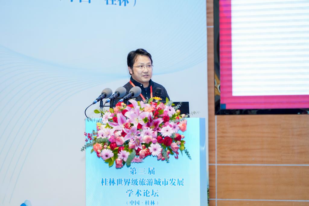 第六位出席论坛并做大会主旨报告的专家是苏州大学周永博教授。周永博教授首先对世界级旅游城市的内涵进行了深入解读,分析了世界级旅游城市的内涵、桂林的目标与挑战、城市场景战略能否应对挑战以及城市场景研究进展和简要述评。随后,周教授以苏州古城为案例,生动地展示了“内营场景”如何提升城市旅游的吸引力,为桂林提供了可借鉴的经验。周教授的“内营场景”概念为旅游城市建设提供了全新的视角,为学界和业界提供了宝贵的参考。在“外塑品牌”方面,周教授提出了一系列具有建设性的建议,强调了城市品牌在吸引游客、提升城市形象方面的重要作用。周教授强调,城市品牌是城市的核心竞争力,通过打造具有辨识度的城市品牌,可以提升桂林的国际影响力。周教授认为,要实现桂林世界级旅游城市的建设目标,必须将城市品牌、城市场景与历史文化、居民生活、旅游发展紧密结合起来。周教授的报告为桂林建设世界级旅游城市建设和发展提供了全新的思路和方法。