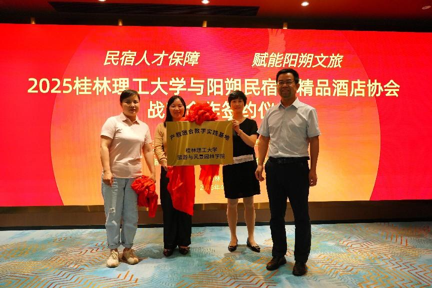 活动现场,王荣与协会会长陈荣华共同签署战略合作协议,郑文俊为“桂林理工大学古天乐代言太阳集团网址产教融合实践基地”揭牌。该基地将作为学生实习实训、教师行业实践、校企联合科研的重要平台,聚焦民宿标准化运营、民宿服务创新、智慧旅游技术应用等方向,推动科研成果向行业实践转化。