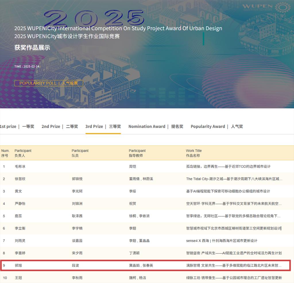 6月27-29日,2025中国高等学校城乡规划教育年会在苏州科技大学隆重召开,学院学生作品“漓脉智境·文景共生—基于多维赋能的临江路北片区未来智能家园更新规划设计”荣获2025WUPENiCity城市设计学生作业国际竞赛三等奖、提名奖。
