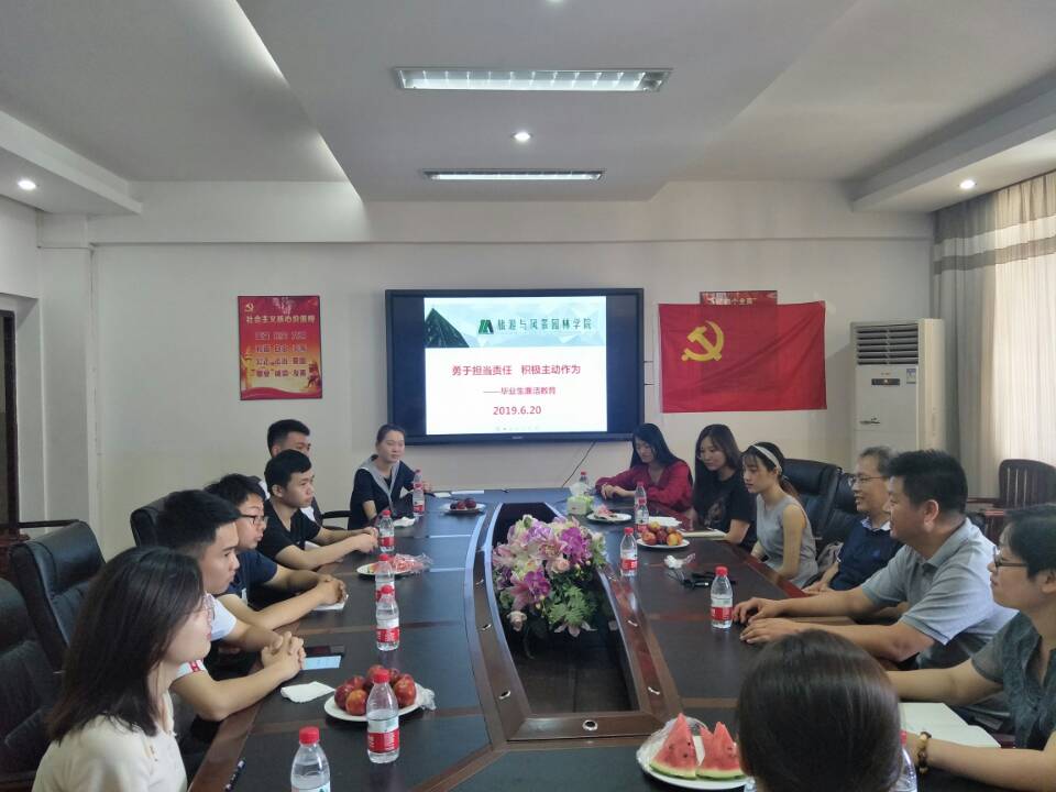 2019年6月20日下午15:00,学院党委书记王璐,学院院长吴忠军与2019届毕业生党员代表约30名开展“勇于担当责任,积极主动作为”主题座谈会,旨在通过对毕业生党员开展诚实守信教育与廉政廉洁教育,引导毕业生党员诚实守信、履行诺言、爱岗敬业、自立自强。同时要激励广大毕业生党员以身作则、以身示范,积极发挥毕业生党员的先锋模范带头作用。