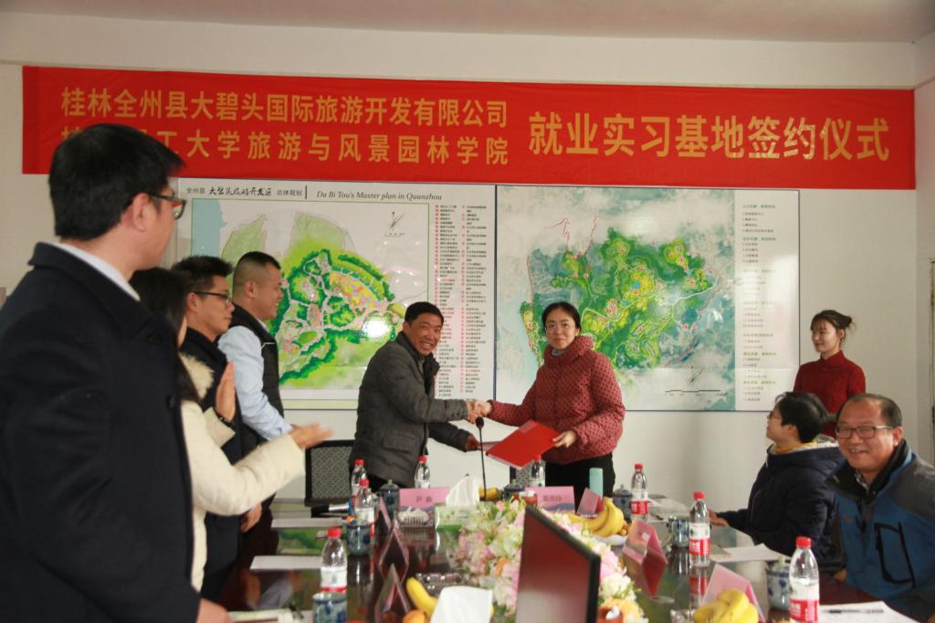 2019年2月28日,由学校招生就业处牵头,迟国东副处长带队,黄燕玲副院长、叶婷副书记、张婷副教授随行,前往全州县大碧头国际旅游度假区进行实习基地签约授牌仪式。