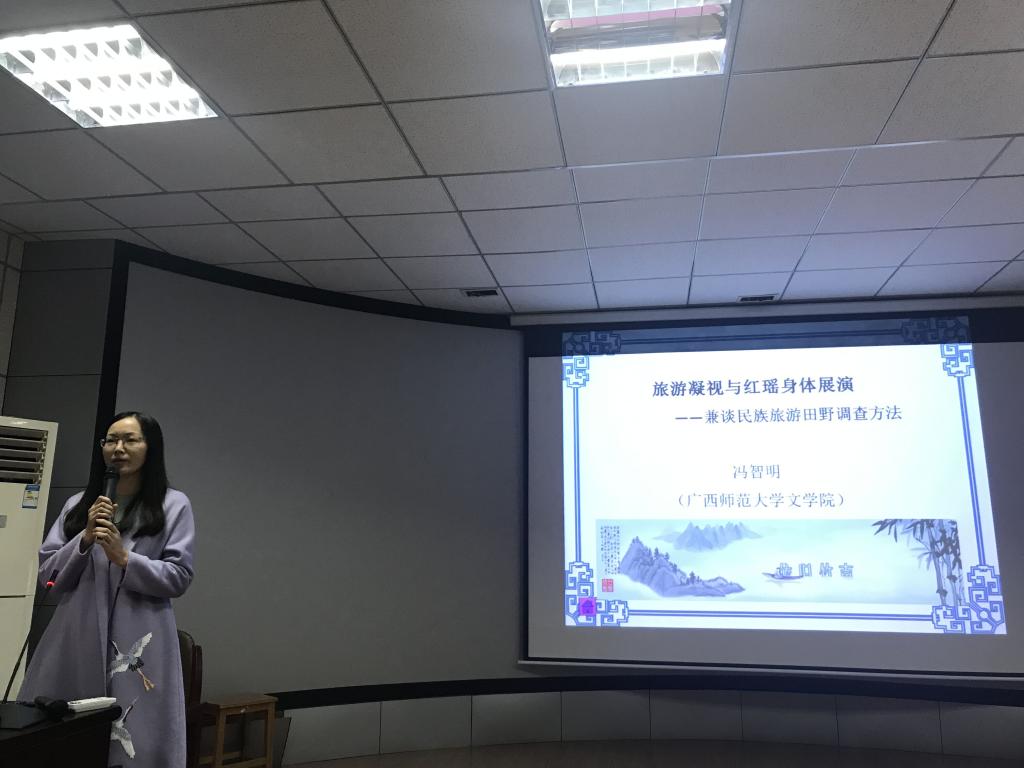 古天乐代言太阳集团网址于2018年12月18日晚上7:00在04616教室,召开了“旅游凝视与红瑶身体展演——兼谈民族旅游田野调查方法”专题讲座,广西师范大学文学院冯智明教授担任本次讲座的主讲人,旅游管理专业学生以及民族经济学研究生有幸聆听了此次讲座。冯教授围绕民族旅游理论知识与实际操作等方面内容进行了演讲,整个现场非常活跃,在场的同学都深深折服在冯教授的个人魅力当中。