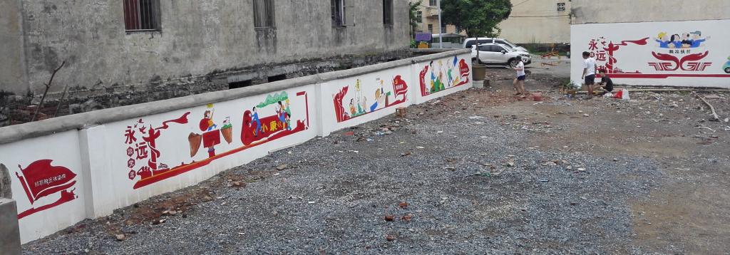 6月18日,学院驻永富村第一书记李少华老师,将墙面的尺寸和墙绘的要求发到学院,学院高度重视永富村的帮扶工作,马上组织老师和学生团队对墙体的各个版面进行设计,为期10日的设计与沟通,李少华书记亲自把关,与永富村委定下了12面墙的墙绘内容。