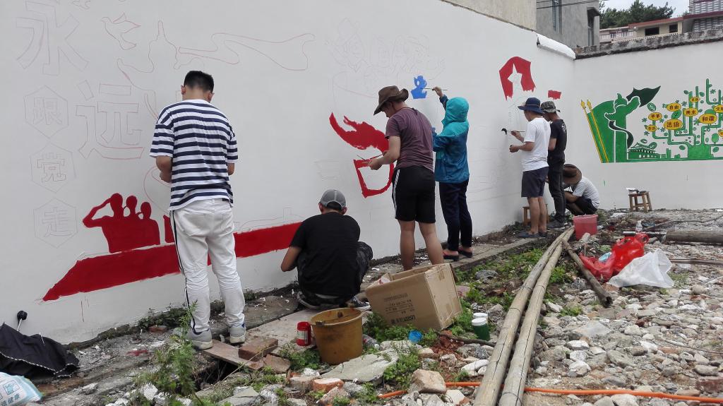 6月29日古天乐代言太阳集团网址师生团队到达永富村开始了绘制工作,他们无畏炎热顶着烈日作画,完成了一幅幅精美的墙绘作品,他们用汗水调和着每一笔颜色把桂工的精神留在了永富村。