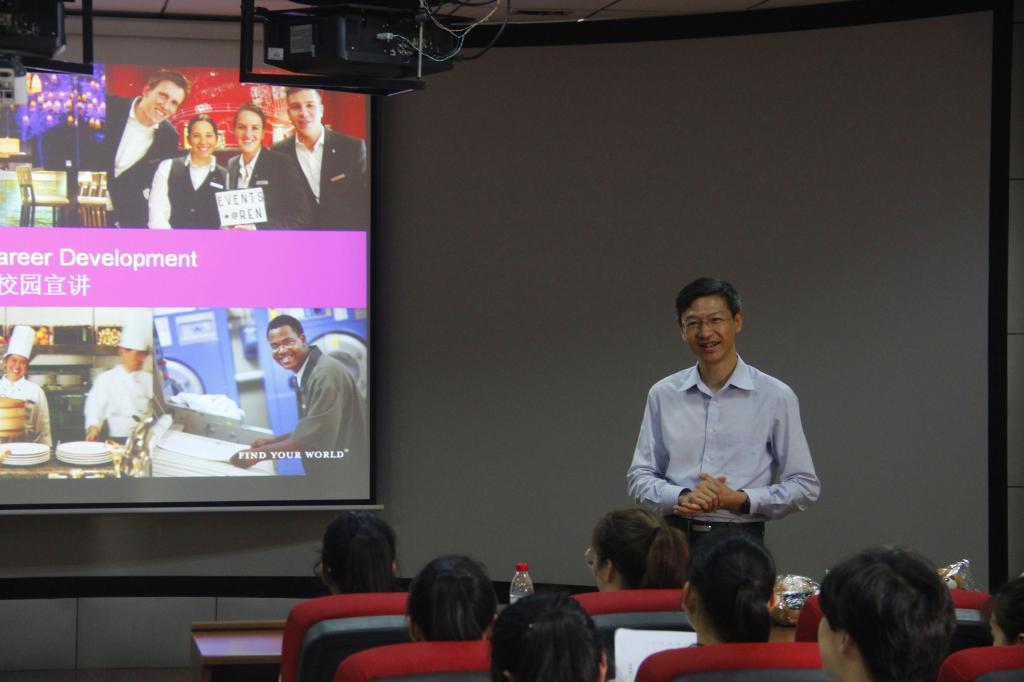 刘翔前辈可谓是一位有前瞻性眼光和坚韧品质的人,通过对自己在桂林、沈阳、天津、三亚、广州等地岗位变换的经历和在喜来登酒店历练的收获等相关职业生涯的介绍,向同学们分享了许多自己宝贵的经验,除此之外,也对同学们今后从事酒店行业提供了很多实用性的建议,让在座的同学们都受益匪浅。