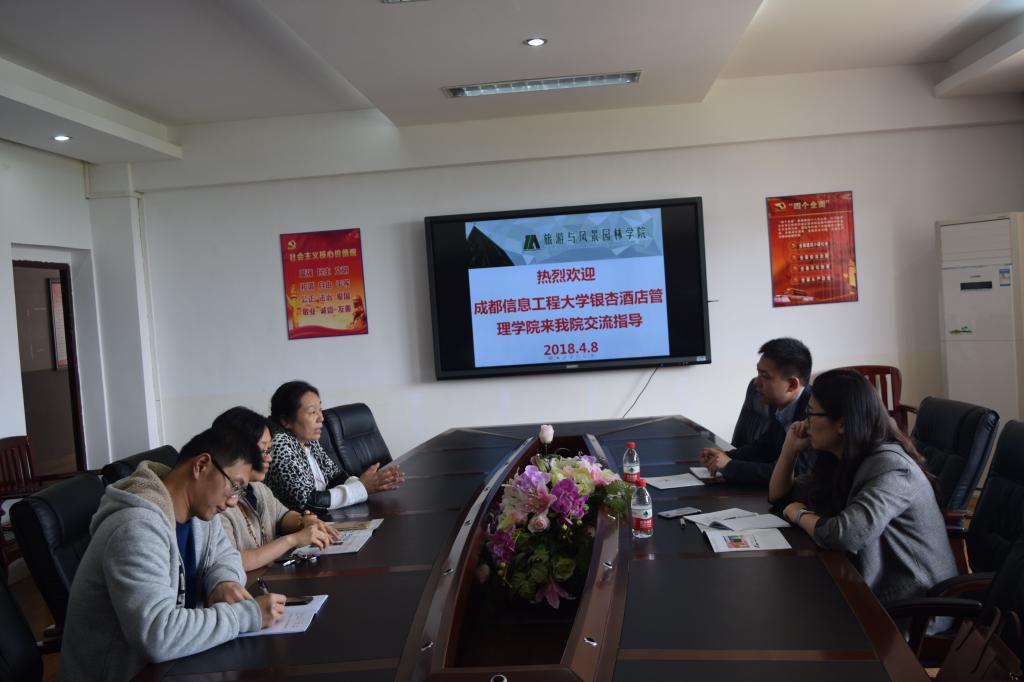 4月8日下午,成都信息工程大学银杏酒店管理学院党总支书记李俊杰、系主任助理徐君宜一行两人来古天乐代言太阳集团网址进行专业交流,旅游学院党委副书记叶婷、实验室主任赵燕和酒店管理系副主任安启与他们进行了座谈交流。