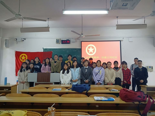 活动伊始,全体奏唱团歌。第一个环节是由团支书简单介绍雷锋同志生前历史同时设有问题进行抢答,个人获得分数计入小组成绩,然后全体同学观看相关宣传雷锋精神的纪录片,进行小组讨论,相互交流,再由小组代表上台发表观看之后的感想。第二个环节是竞技游戏环节——猜诗词大赛。由PPT展示出诗词内容,团支部成员通过举手方式进行抢答,同学们都非常积极地参与其中。第三个环节是关于校园文明的相关知识讲解,包括校园卫生与校园文明生活,以及校园安全,让团组织成员了解到文明校园的重要性。最后是通过“心口不一007” 游戏考验成员的反应灵敏程度。支部成员全员参与,不仅增强同学的团结协作能力,还增进了同学间的友谊。活动的最后,团支书宣布了本次团日活动游戏的最高分小组,并进行了颁奖仪式。