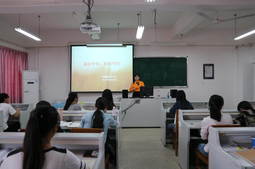 为积极响应“诚信教育主题月”活动以宣扬“诚信立身、节约光荣、浪费可耻”的优良观念,培养同学们“诚实守信、勤俭节约”的优良意识,做一个高素质的当代大学生。风景园林2015-2班班主任巫柳兰老师于5月25日下午在04519教室召开了“诚实守信、勤俭节约”主题班会。
