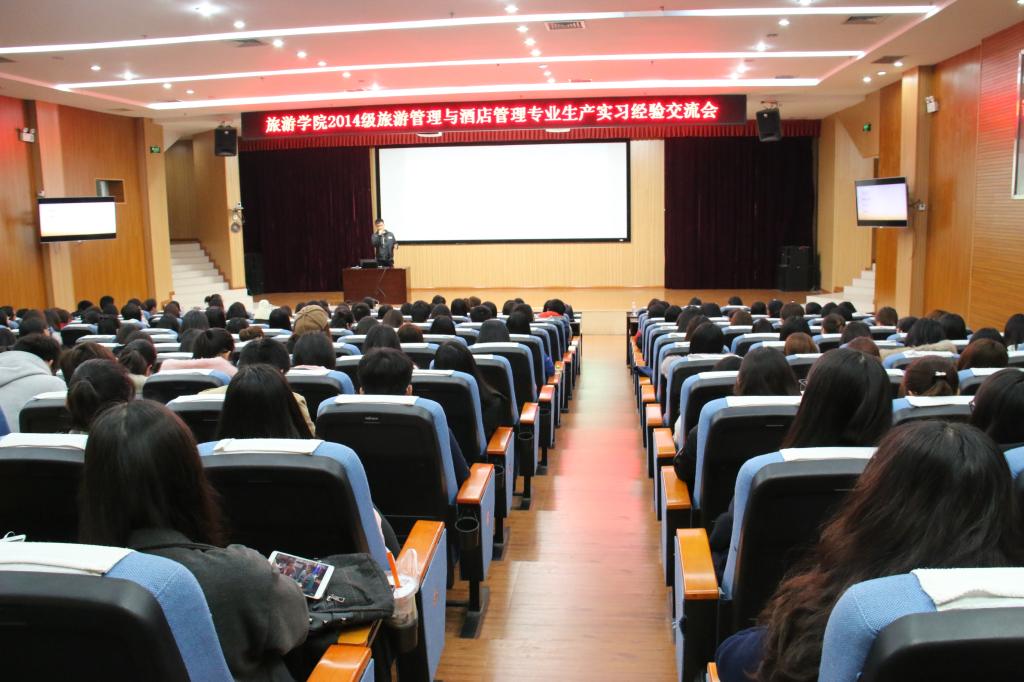 2017年3月16日晚7点半, 旅游学院在雁山校区图书馆报告厅举办了旅游学院2014级旅游管理与酒店管理专业的生产实习经验交流会。旅游学院2014级优秀学生代表就实习期间的收获感悟进行分享交流,旅游学院辅导员唐名丽老师、黄小华老师及旅游学院2015、2016级旅管、酒店专业学生聆听了本次的交流会。
