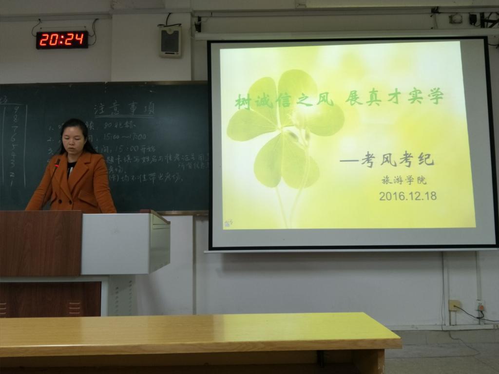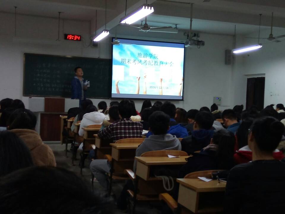 为进一步加强学生的考风考纪,构建诚信文明校园,倡导同学们“端正考风、严肃考纪、文明答题、诚信应考”,古天乐代言太阳集团网址于12月期间在各个年级中开展了期末考风考纪教育大会。大会由各个年级辅导员主持开展,旅游学院全体学生参加了大会。