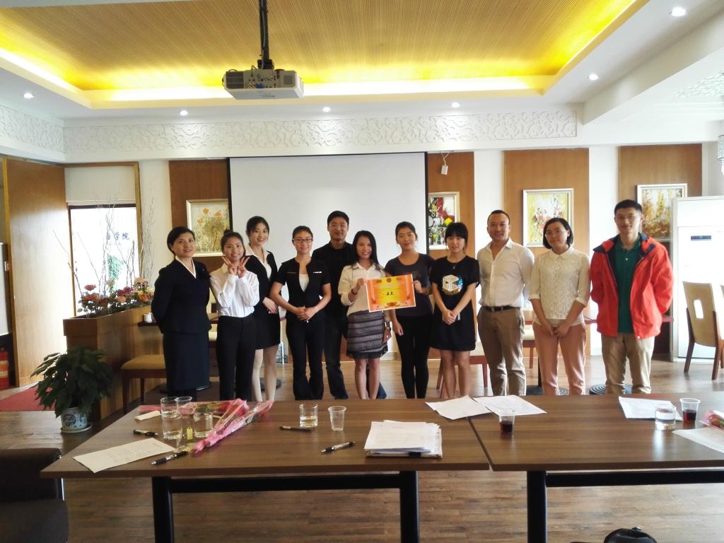 为提高酒店管理专业学习英语的兴趣,提高学生专业英语表达能力,使学生能在具体的酒店服务、旅游服务情景中灵活、准确地运用英语,酒店管理教研室于5月17日在旅游学院西餐实训室成功举办了“旅游英语情景大赛”。比赛由酒店管理教研室罗楠老师主持,旅游学院分管教学的黄燕玲副院长、酒店管理教研室主任王志文老师,旅游学院团委书记李少华老师以及酒店管理教研室的部分教师出席了大赛并担任评委。本次大赛面向2014级酒店管理专业本科全体学生,共14个小组参加了比赛。学生们充分发挥了创造力和想象力,自编、自导,演绎了酒店各个情景,进行酒店情境角色扮演。包括酒店的预订、客人入住酒店、礼宾服务、餐饮服务、处理客人的各种投诉和纠纷等等。对话内容生动活泼,表演形式丰富多样。每组学生的表演都经过精细准备,包括服装、道具和台词等,在即将离校参与实习之际献上了一场精彩纷呈的表演。