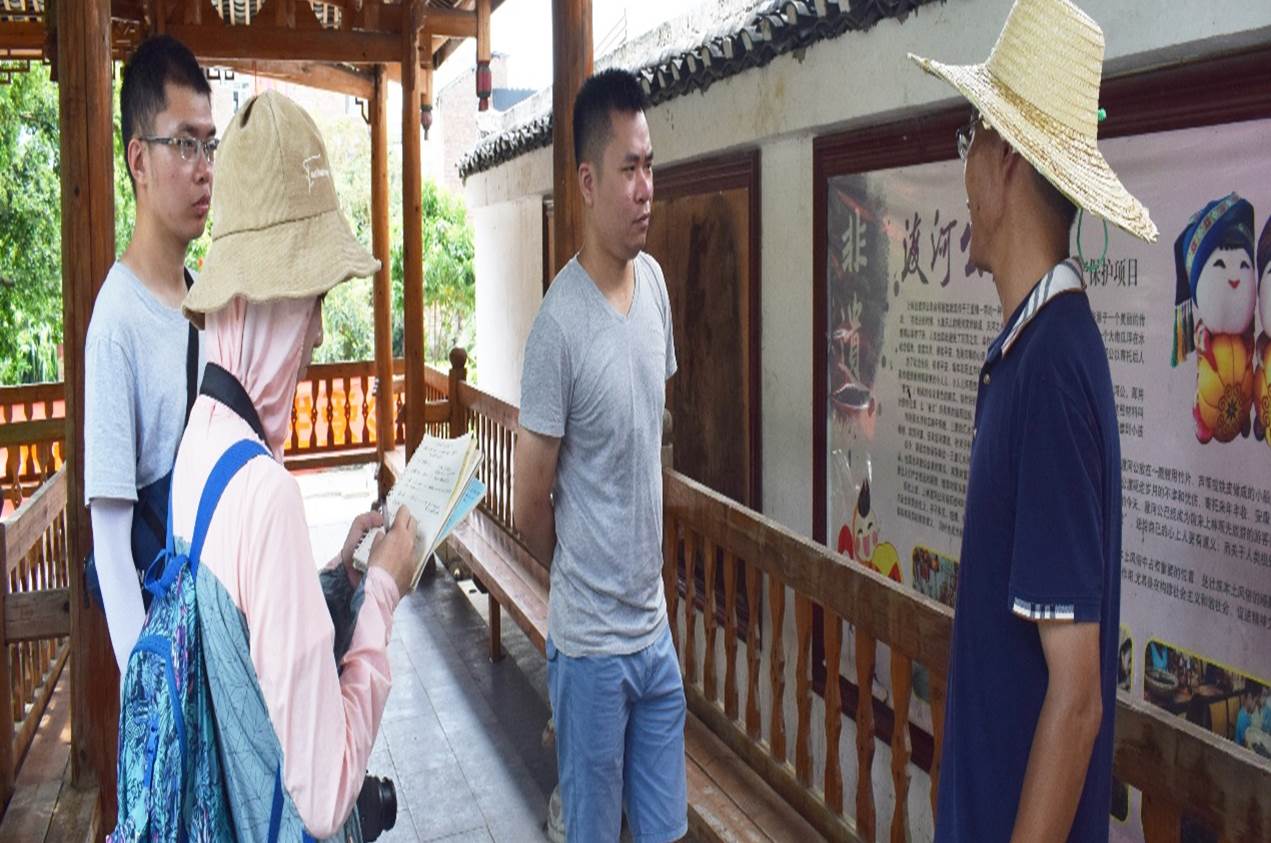7月26日下午开始,实践队队员们沿着徐霞客的踪迹,到达忻城古蓬镇。在两天多的时间里,队员们冒着烈日,依次对滂江两岸的东因村、下俭村、内联村、古蓬镇、局地村、东岸屯、福增村、红渡镇的人口姓氏、自然生态、历史文化、生产生活、村落布局以及民俗信仰等情况进行了较为深入的调查。每到一个村子,指导老师针对调查重点对队员们进行讲解,然后队员们根据老师的任务安排分组行动。7月下旬的滂江两岸,正值村民下田抛秧的农忙时节,抵达村子之后,队员们先自行对村寨的村落布局、自然生态进行了调查,其中一组队员到村委会找村干部进行村寨生产生活情况、历史情况、人口姓氏情况等方面的了解,以及村干部对当地发展旅游的建议与态度,并将村委会外墙贴的公示等进行拍照以及族谱等资料的收集,一组队员到村内大树脚下等村中老人集中的地方,同村里的老人家进行口头访谈,访谈内容主要是村子的历史、壮族文化、信仰文化等内容,并对村中祠堂、土地庙的历史以及相关祖先祭祀、信仰活动进行调查,还有一组队员则是前往滂江河,调查这个村子区域内的滂江河的水质、河畔的主要植物等自然环境情况,并随机对村民进行访谈,掌握村民对八寨历史文化、古思起义以及壮族传统文化的了解程度。