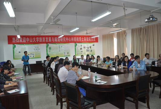林晓桃博士的报告主要介绍了自己在美国两年的学习、生活经历,对比了中西方社会文化的差异,同时也对中美两国旅游教育的差异进行了对比分析。会后,林晓桃博士还与旅游学院的师生进行了座谈,解答了研究生有关申请留学、出国交流方面的疑问,并就如何提升桂林理工大学旅游管理专业教学质量进行了讨论。