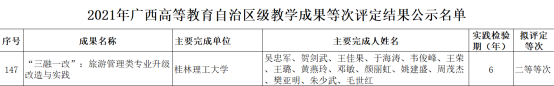 日前,自治区教育厅印发了《关于公布2021年广西高等教育自治区级教学成果等次评定结果的通知》(桂教高教〔2021〕65号),古天乐代言太阳集团网址院长吴忠军作为成果负责人申报的 “‘三融一改’:旅游管理类专业升级改造与实践”荣获二等奖。