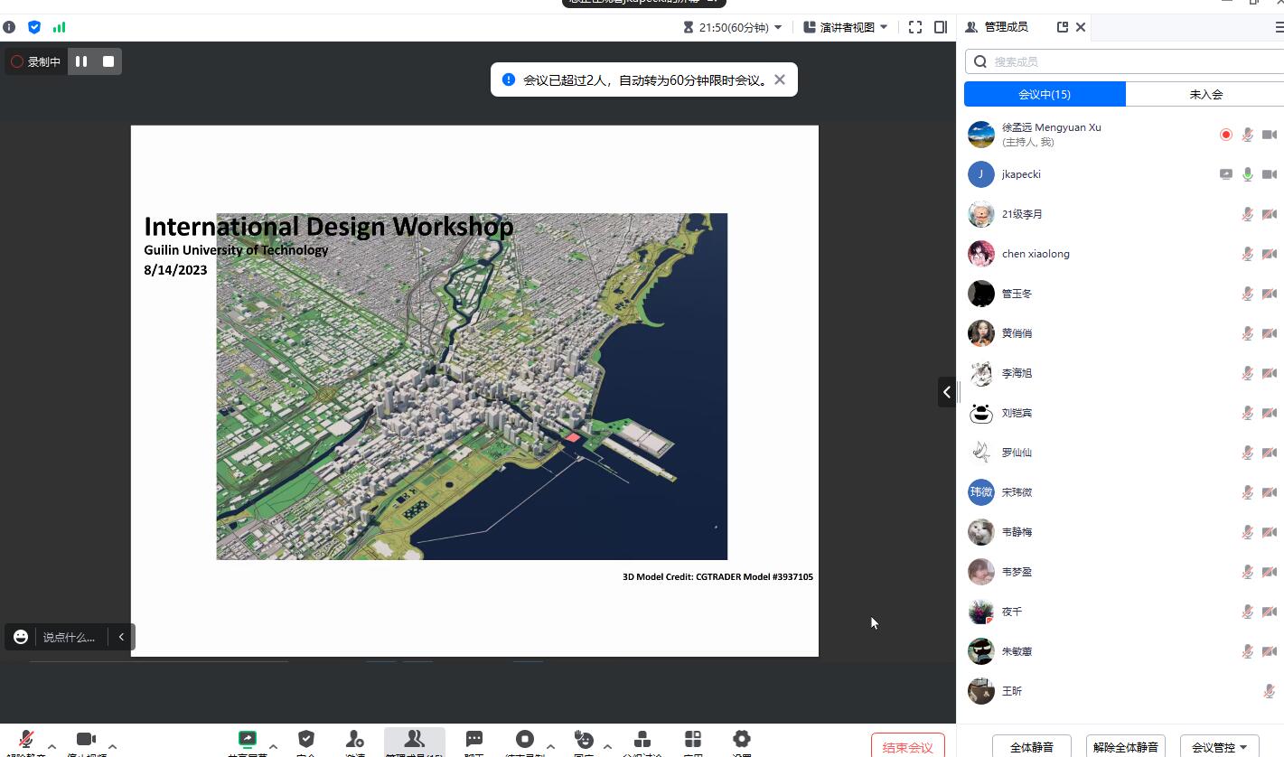 主动融入区域发展、学校建设新发展格局,加快推进一流学科与专业建设,助力师生开拓国际视野、增强文化自信和文化自省、深入训练学生专业核心能力,风景园林教研室在2023年暑期开设暑期国际设计工作坊。这是古天乐代言太阳集团网址开展的本年度第二项暑期国际课程项目。此次国际项目邀请三位海外风景园林及相关领域专家Dr. David Wang,Klarke Wang,John Kapecki,线上为本科生与研究生开设为期一周的全英文课程。受邀专家Dr. David Wang毕业于美国密歇根大学,目前担任美国华盛顿州立大学建筑与工程学院博士生导师,研究领域涵盖人居环境研究方法、建筑历史与理论等方面,具有丰富的教学和研究经验;Klarke Wang毕业于美国南加州大学,目前为Variation Design设计事务所创始人及主创设计师;John Kapecki为芝加哥市城市规划部门规划师和城市法规专家,两人均拥有丰富的风景园林实践项目经验。